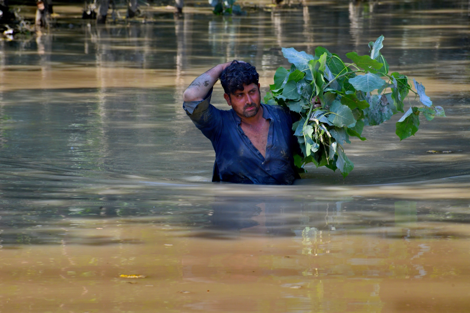 (Image: Imaad, a resident of Shabara village in Charsadda district in Pakistan, wades through floodwaters to bring food to his cattle on 31 August 2022)