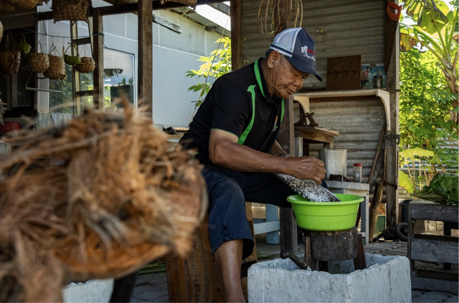 Wak Udin started working when he was just 14, and his stories are like windows back in time. Back then, he worked for the Clunies-Ross family, taking on a range of hard tasks. He was often on the boats, called jukongs, with their small sails, heading out to harvest coconuts or hunt on uninhabited islands like North Keeling. No matter the weather – stormy skies or calm seas – Wak Udin was out there, sourcing hundreds of coconuts by hand. He’d gather as many as 600 in a single trip, sailing them back to the sheds where the women would dehusk and dry them, readying them for shipment to Singapore. It was backbreaking work, earning him just a few rupees for his effort. Even with the option to leave for better opportunities in Southeast Asia, Wak Udin chose to stay. He always said, “This is my land, and I want to be where I’m from.”