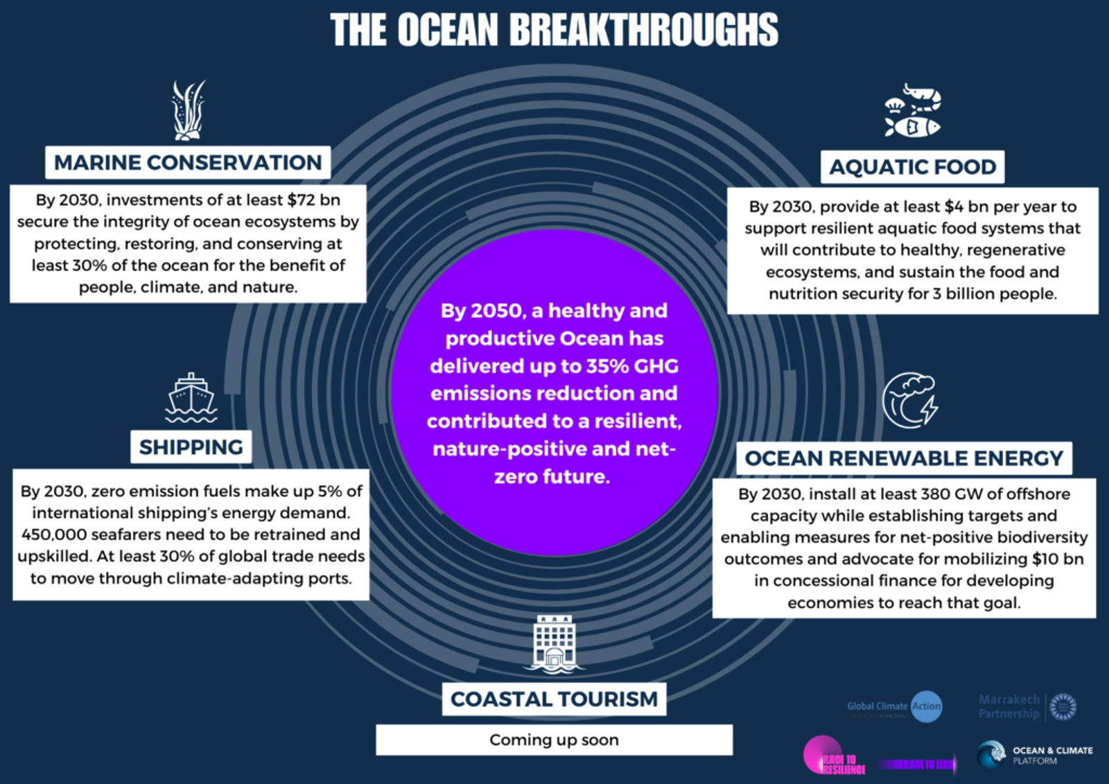 Resulting from the joint efforts of the Ocean & Coastal Zones community under the Marrakech Partnership for Global Climate Action, and building on the Ocean for Climate Declaration, the Ocean Breakthroughs identify five turning points to reach by 2030 to achieve a healthy and productive ocean in 2050. They are articulated around five key ocean sectors: marine conservation, ocean renewable energy, shipping, aquatic food, and coastal tourism. Accelerated action and investments in each will help unlock the potential of the ocean as a source of solutions to the pressing challenges posed by climate change and biodiversity loss.