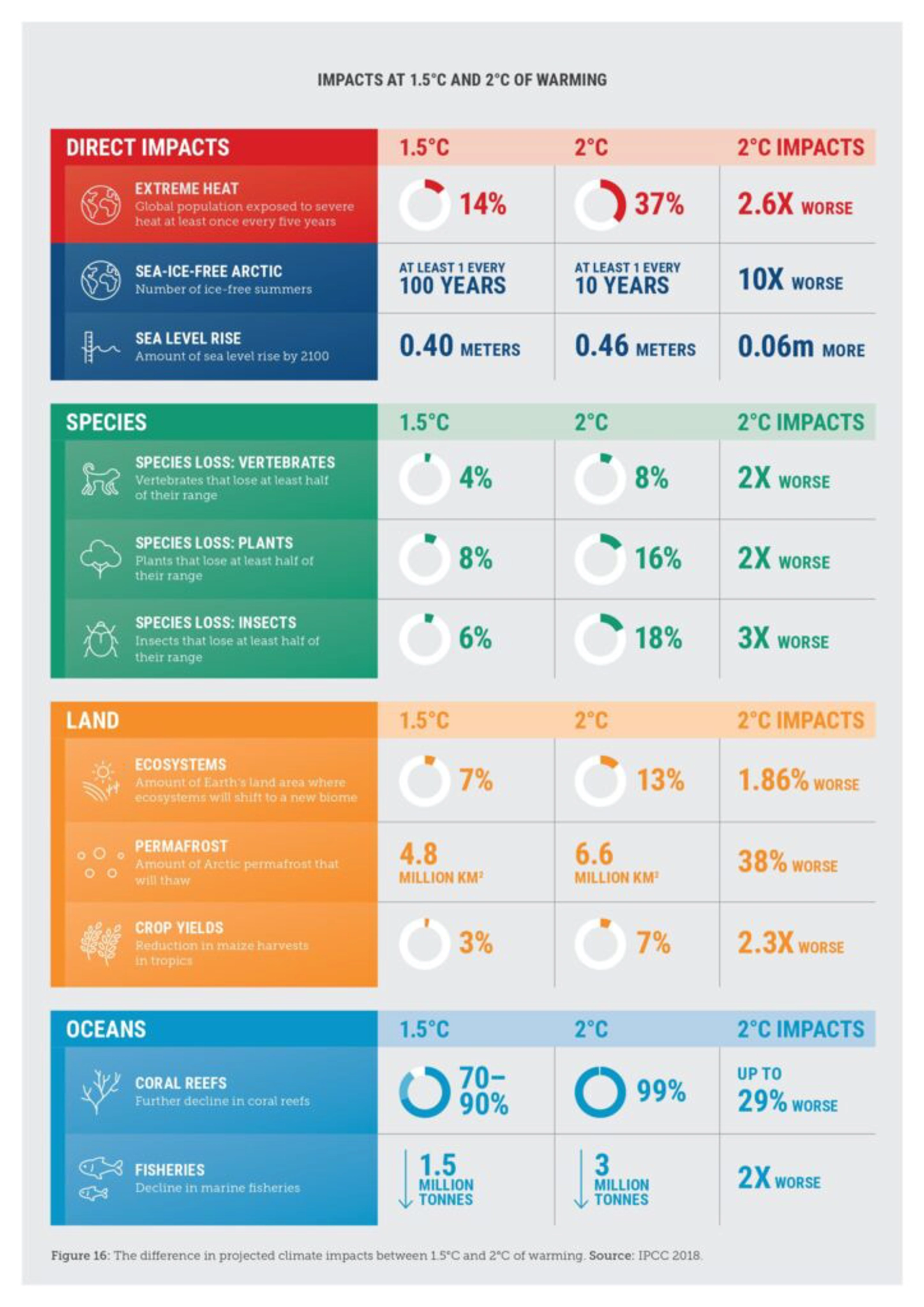 In reality, the difference between 1.5°C and 2°C degrees is not merely a temperature rise of 0.5°C – but as the chart below shows, it means climate risks will be at least two times worse.